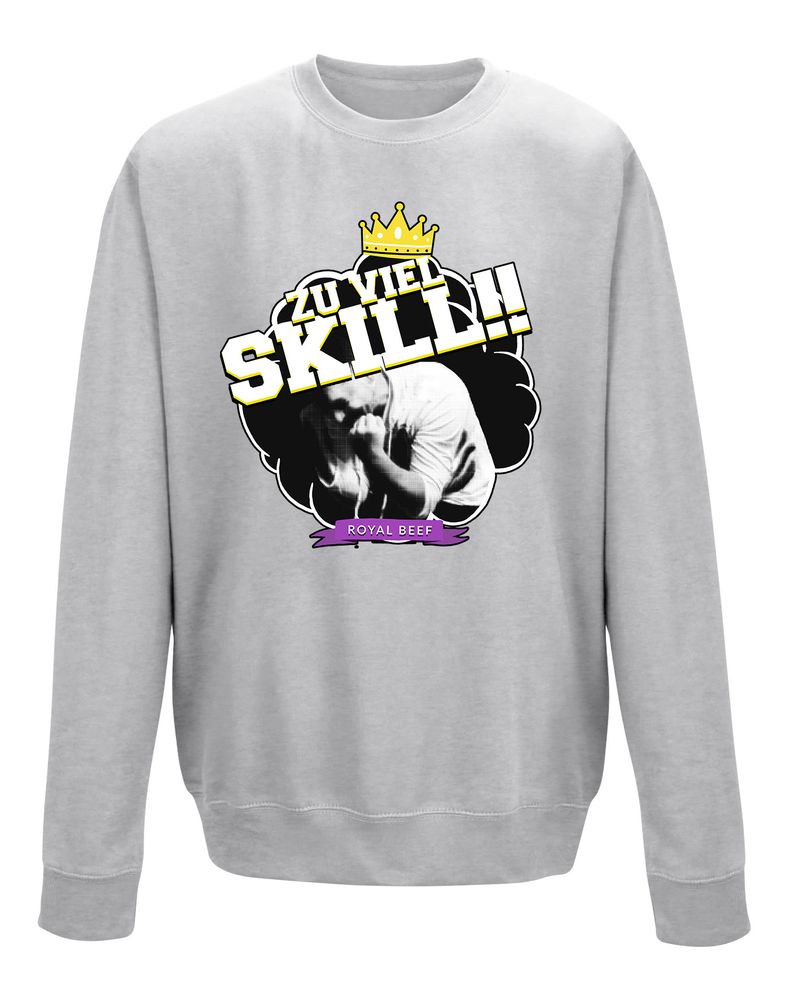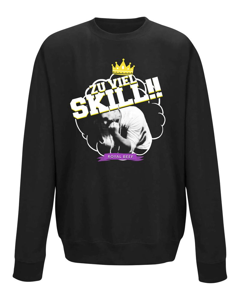 Das Sweatshirt zeigt die Krone des Royal Beef Logos und Simon, der sich mit seinem Ausruf Zu Viel Skill!! über seinen Sieg freut.