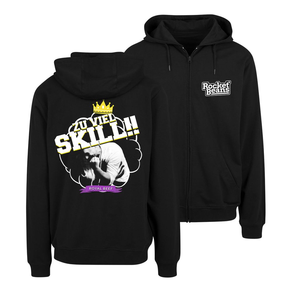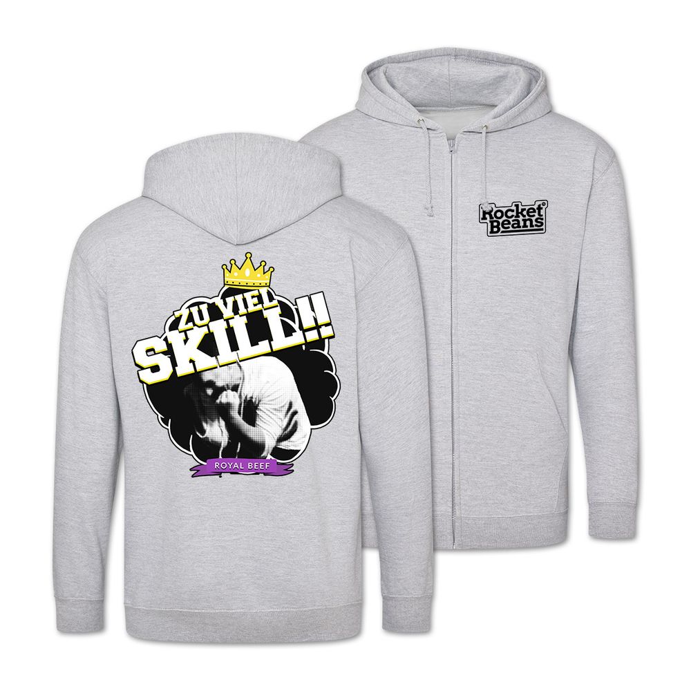 Der Zipper zeigt vorne Rocket Beans und hinten die Krone des Royal Beef Logos und Simon, der sich mit seinem Ausruf "Zu Viel Skill!!" über seinen Sieg freut.