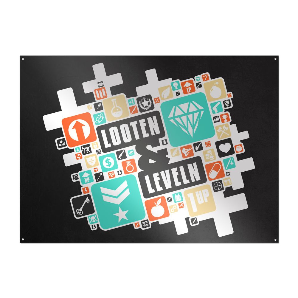 Auf dem Metallschild sieht man die Worte looten & leveln, umrahmt von verschiedenen Symbolen.