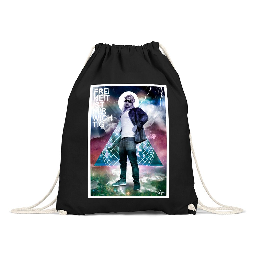 Der schwarze Turnbeutel zeigt Eduard Laser.