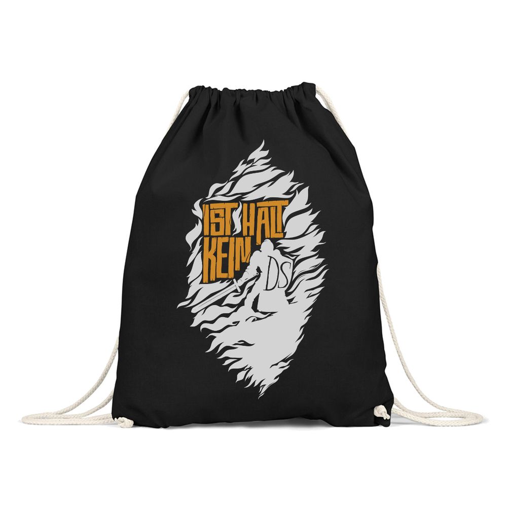 Der schwarze Turnbeutel zeigt den Spruch Is Halt Kein DS.