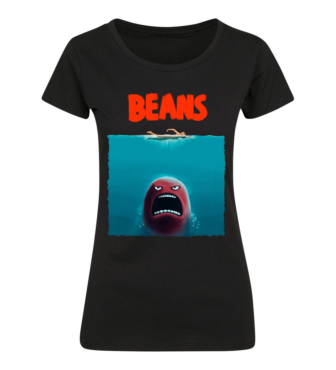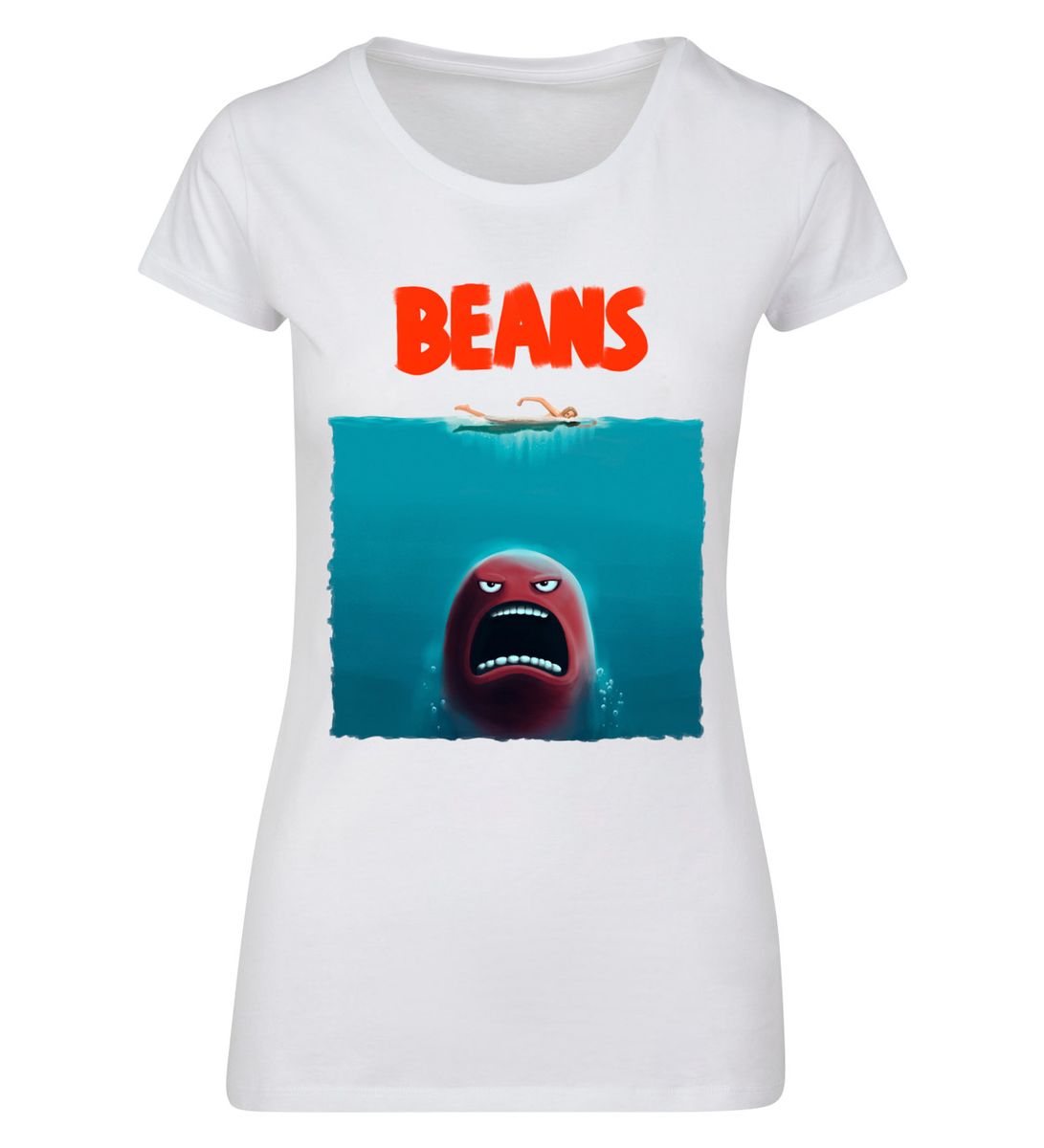 Das T-Shirt zeigt die Bohne im Stil des Weißen Hai Filmplakats.