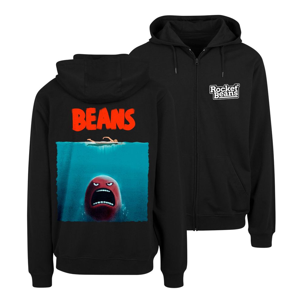 Der Zipper zeigt vorne Rocket Beans und hinten die Bohne im Stil des Weißen Hai Filmplakats .
