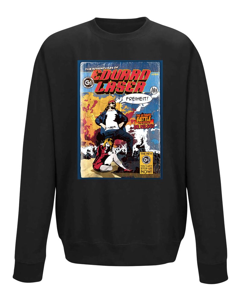 Das Sweatshirt zeigt ein Comiccover von Eduard Laser.