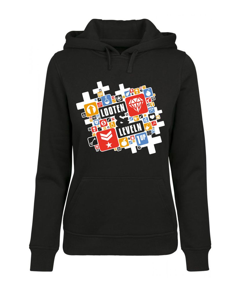 Der Girl Hoodie zeigt die Worte looten & leveln, umrahmt von verschiedenen Symbolen.