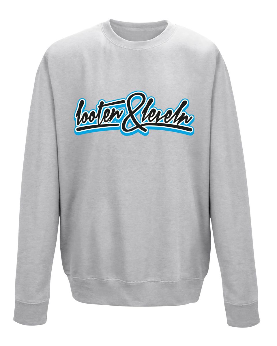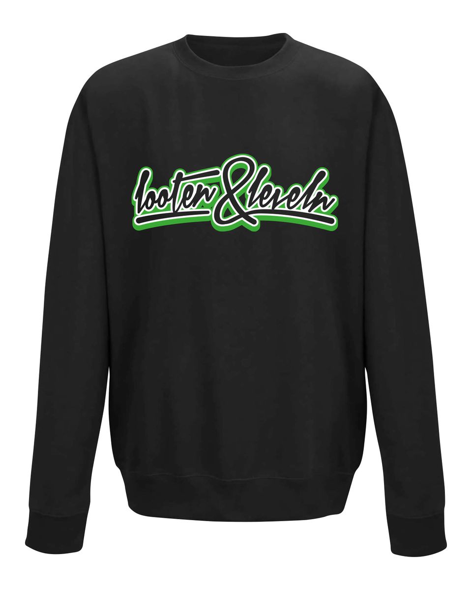Das Sweatshirt zeigt die Worte looten & leveln.