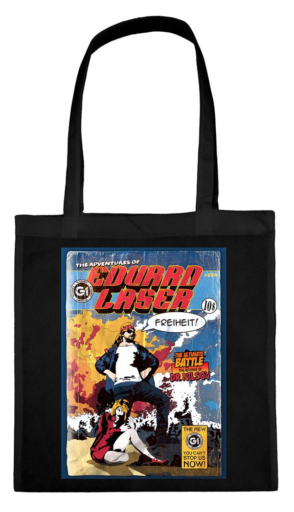 Der schwarze Beutel zeigt ein Comiccover von Eduard Laser.