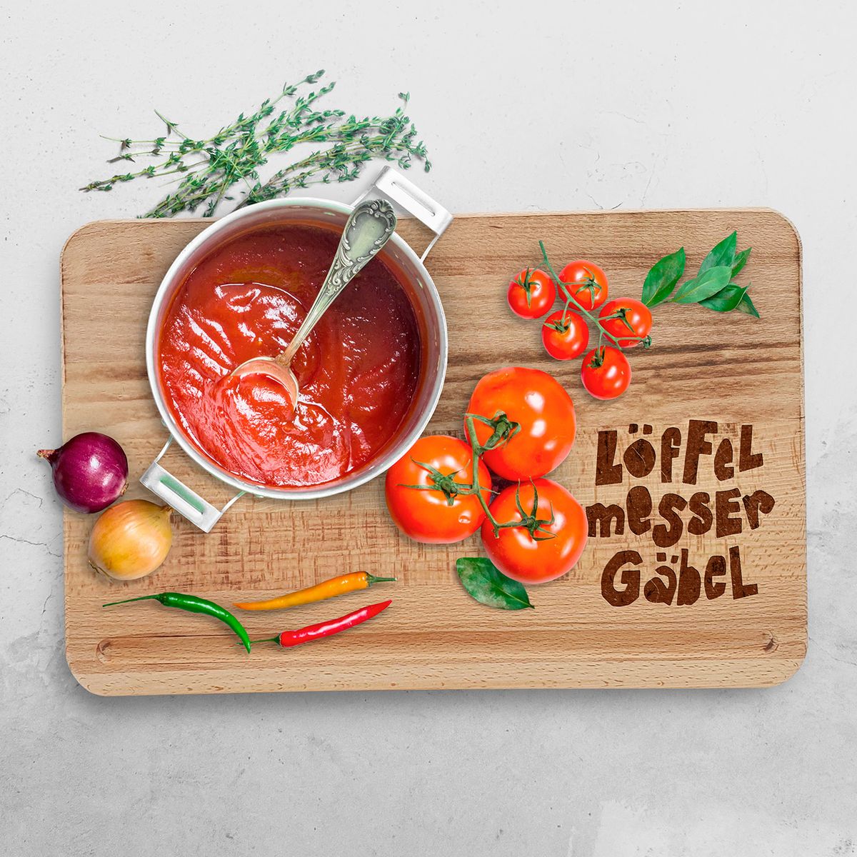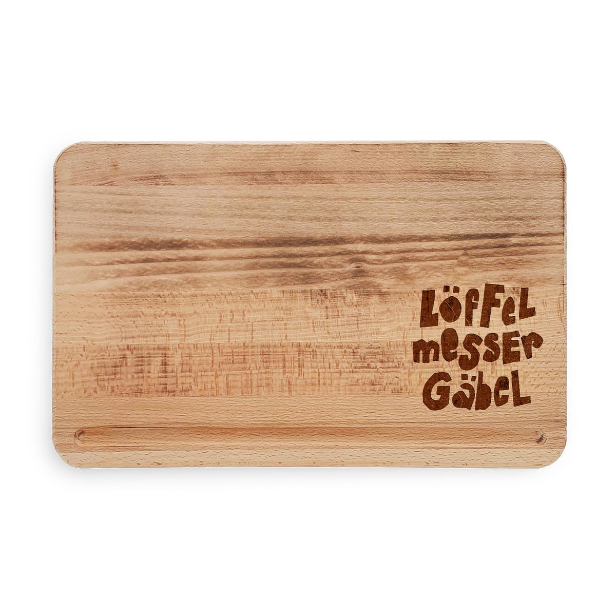 • Löffel Messer Gäbel Logo mit Brandstempel im Brett verewigt