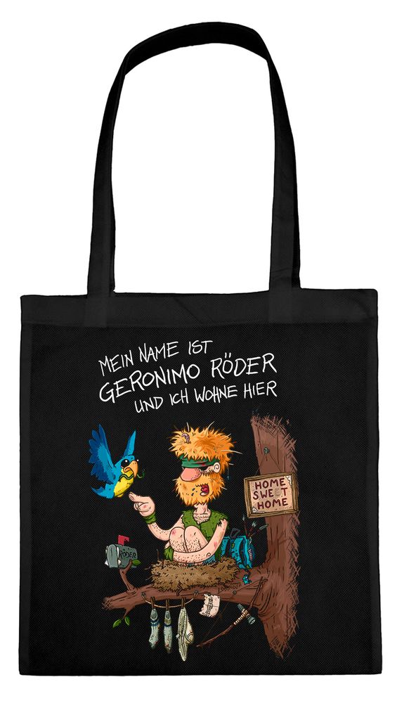 Der schwarze Beutel zeigt den Pen & Paper Charakter Geronimo Röder in einem Vogelnest auf einem Baum sitzen. Darüber steht der Spruch Mein Name Ist Geronimo Röder Und Ich Wohne Hier.