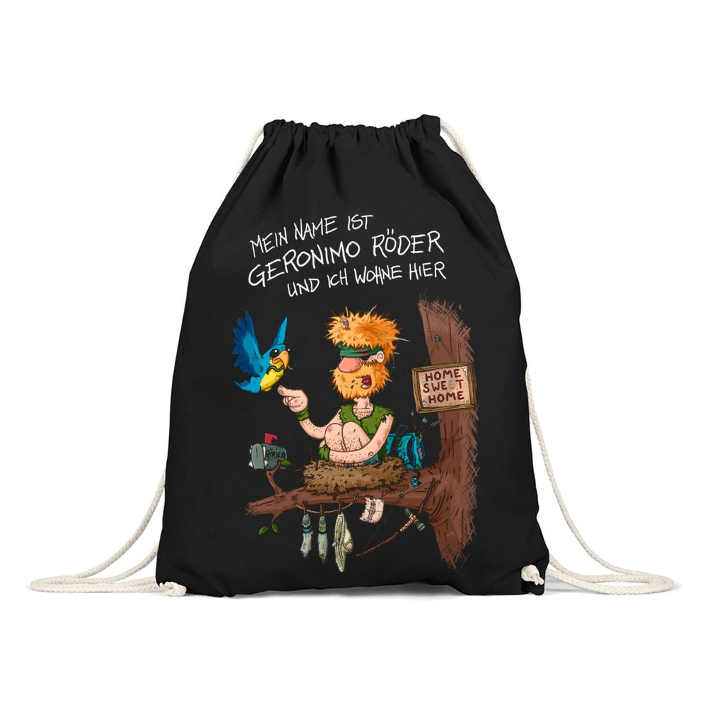 Der schwarze Turnbeutel zeigt den Pen & Paper Charakter Geronimo Röder in einem Vogelnest auf einem Baum sitzen. Darüber steht der Spruch Mein Name Ist Geronimo Röder Und Ich Wohne Hier.