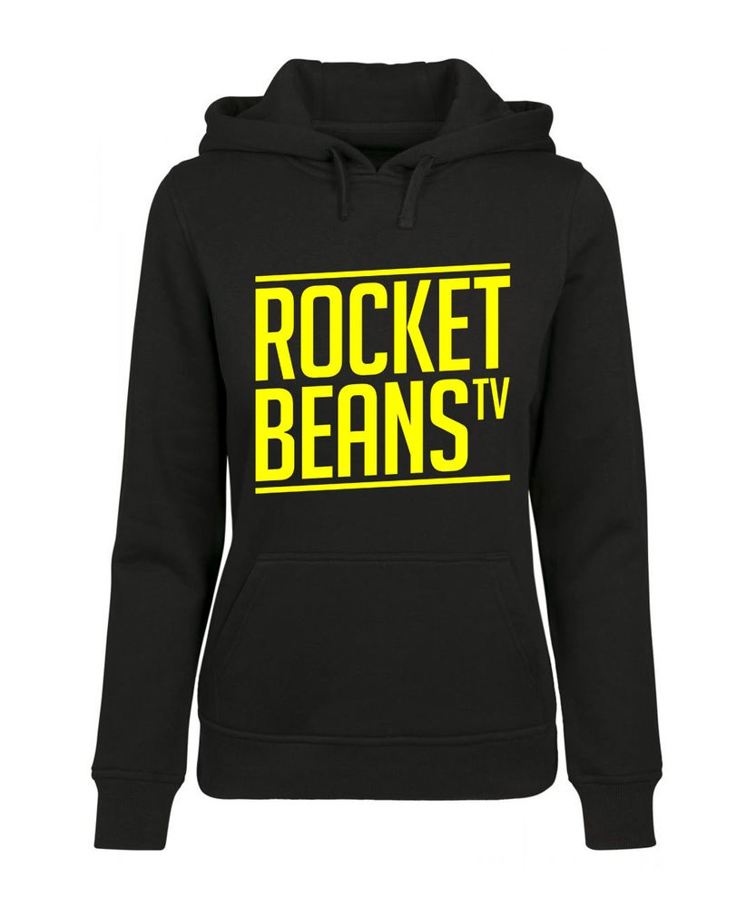 Der Girl Hoodie zeigt Rocket Beans TV in gelb.